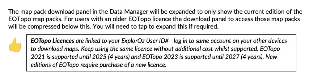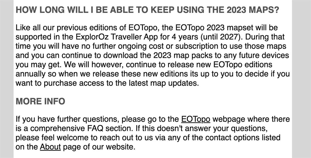 I’ve been a paying member since 2018 and have used and supported ExplorOz for nearly eight years because I value the POI and track database. I don't want to escalate this unnecessarily; I simply ask that you don't apply this 4-year limit retroactively to legacy purchasers of the 2023 maps.