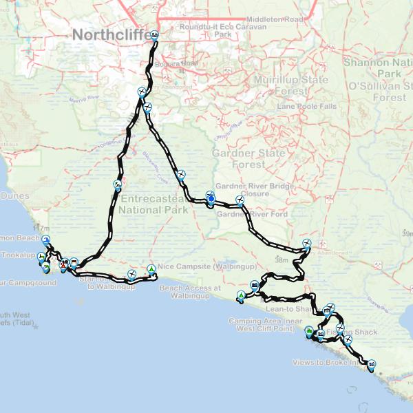 Windy Harbour (but watch swell and tides or you could get caught against the dunes halfway out) or via a track parallel to the dune lines. This track is a bit soft and cut up but is easy and there is an earlier beach access/exit marked via a waypoint here. If traveling on