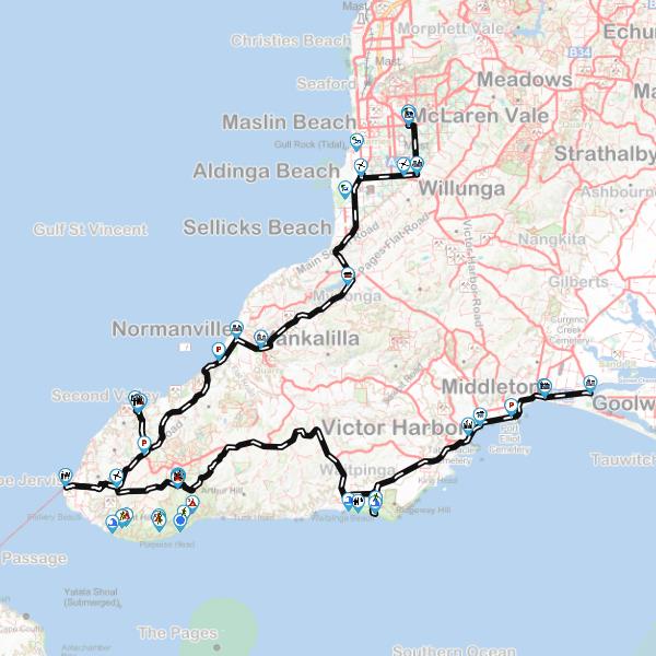 Normanville, passing a few smaller wineries on the way, the trek heads past Willunga and ends approx 40km later at McLaren Vale (approx 40mins drive south of