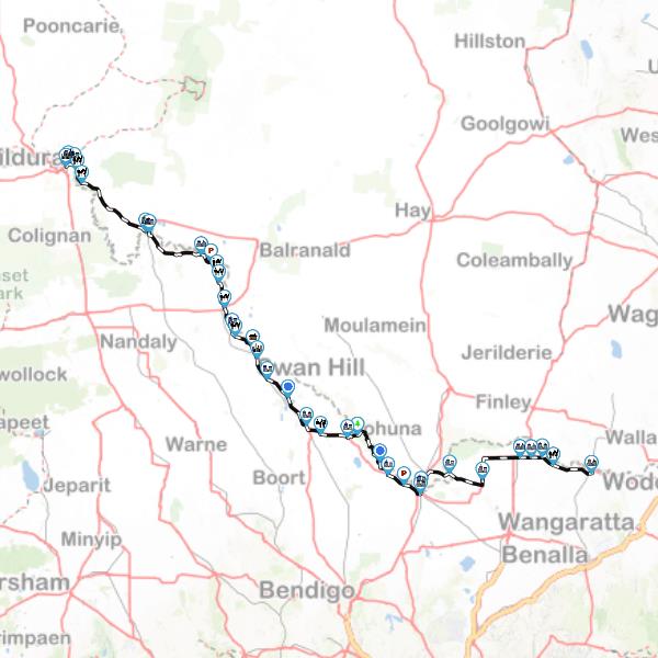 Due to the close proximity of the Murray River, there is a mixture of dry, arid country and fertile, irrigated land, which makes a rather interesting drive. The route is relatively good and there are many long straight sections on flatter terrain. As you journey from Yarrawonga, the timbered countryside diminishes and turns to more dry and arid conditions as you head closer towards Echuca and beyond.